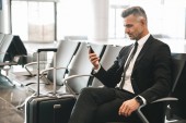Obraz białego młodzieńca siedzącego na kanapie ze smartfonem i