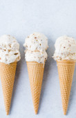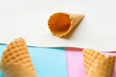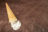Surowy biały ryż w waflu stożkowym. Płaskie ułożenie, widok z góry, przestrzeń do kopiowania, minimalne