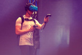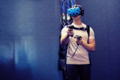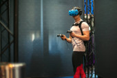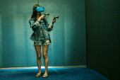 Dziewczyna w wirtualnej rzeczywistości, w okularach i joystickach.