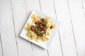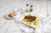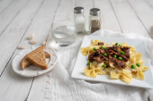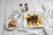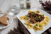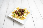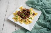 Końcówki wołowiny nad muszką makaron i sos Alfredo