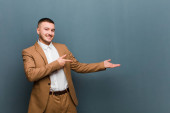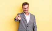 młody przystojny biznesmen wskazując na aparat z zadowolonym, pewny siebie, przyjazny uśmiech, wybierając cię na płaskim tle