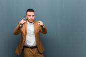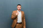 młody przystojny mężczyzna wygląda poważnie, surowy, zły i niezadowolony, co czas się znak na płaskim tle