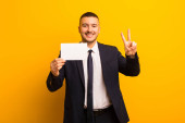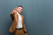 młody przystojny mężczyzna wygląda skoncentrowany i medytuje, czuje się zadowolony i zrelaksowany, myśląc lub dokonując wyboru na płaskim tle