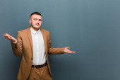 młody przystojny biznesmen czuje się nieświadomy i zdezorientowany, nie wiem, który wybór lub opcja wybrać, zastanawiając się na płaskim tle