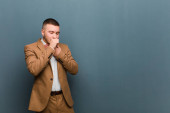 młody przystojny biznesmen czuje się zszokowany i zdumiony trzymając twarzą w rękę z niedowierzaniem z szeroko otwartymi ustami na płaskim tle