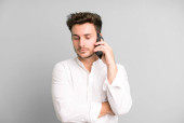 młody, przystojny biznesmen o skoncentrowanym spojrzeniu, zastanawiający się z wątpliwym wyrazem twarzy, spoglądający w górę i w bok na płaskie tło