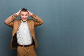 młody, przystojny biznesmen czujący się szczęśliwy i zakochany, uśmiechnięty jedną ręką obok serca, a drugą rozciągnięty z przodu na płaskim tle