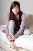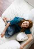 młoda kobieta zrelaksowany, leżąc na kanapie wnetrze