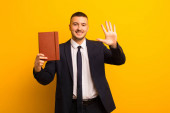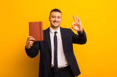 młody przystojny biznesmen na płaskim tle z pamiętnikiem