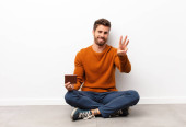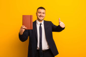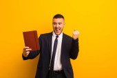 młody przystojny biznesmen na płaskim tle z pamiętnikiem