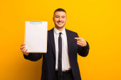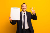 młody przystojny biznesmen na płaskim tle z tabliczką