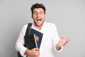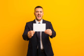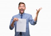 młody przystojny biznesmen na płaskim tle trzymając pusty kawałek papieru