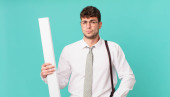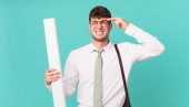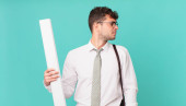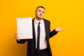 młody przystojny biznesmen na płaskim tle trzymając pusty kawałek papieru
