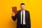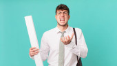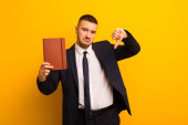 młody przystojny biznesmen na płaskim tle trzymając pusty kawałek papieru