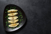 Talerz smażonych koreańskich pierogów na rustykalnym czarnym stole. Dim sum na talerzu. Widok z góry