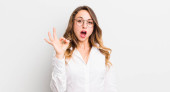 Zdjęcie "młoda ładna blondynka czuje się zdumiony i otwarte usta wskazując w górę z zaskoczony i zaskoczony wygląd na płaskiej ścianie kolor" może być wykorzystywane do celów osobistych i komercyjnych zgodnie z warunkami zakupionej licencji Royalty-free. Obraz jest dostępny do pobrania w jakości wysokiej rozdzielczości do 5760x3840.
