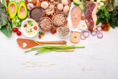 Zdjęcie "Ketogenic niskowęglowodanowej koncepcji diety. Składniki zdrowej żywności " może być wykorzystywane do celów osobistych i komercyjnych zgodnie z warunkami zakupionej licencji Royalty-free. Obraz jest dostępny do pobrania w jakości wysokiej rozdzielczości do 5760x3840.
