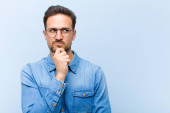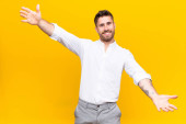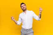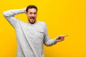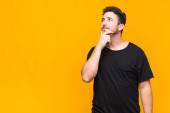 młody handdosme człowiek uśmiechający się szczęśliwie i marząc lub wątpiąc, patrząc z boku na płaską ścianę koloru