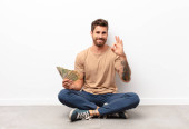 młody handdosme człowiek uczucie szczęśliwy, zrelaksowany i zadowolony, pokazując aprobatę z okay gest, uśmiechając się do płaskiej ściany kolor