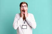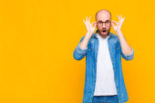 młody handdosme człowiek wygląda podekscytowany i zaskoczony, otwarte usta z obu rąk na głowie, czując się jak szczęśliwy zwycięzca przeciwko płaskiej ścianie kolor