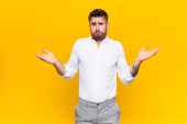 młody handdosme człowiek czuje się dumny, złośliwy i arogancki podczas intrygowania zły plan lub wymyślanie sztuczki przeciwko płaskiej ścianie kolor