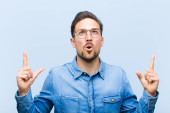 młody handdosme człowiek czuje się zszokowany i zaskoczony, wskazując i patrząc w górę ze zdumieniem, otwarte usta spojrzenie na płaską ścianę koloru