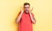 Zdjęcie "młody handdosme człowiek czuje się zszokowany i podekscytowany, śmiejąc się, zdumiony i szczęśliwy z powodu nieoczekiwanej niespodzianki przeciwko płaskiej ścianie kolor" może być wykorzystywane do celów osobistych i komercyjnych zgodnie z warunkami zakupionej licencji Royalty-free. Obraz jest dostępny do pobrania w jakości wysokiej rozdzielczości do 5760x3840.