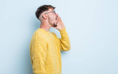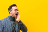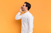 młody handdosme człowiek krzyczy głośno i gniewnie skopiować przestrzeń na boku, z ręki obok ust o płaską ścianę koloru