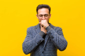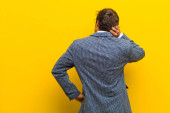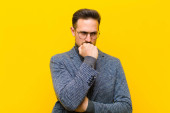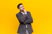 młody handdosme człowiek o skoncentrowanym wyglądzie, zastanawiając się z wątpliwym wyrażeniem, patrząc w górę i w bok o płaską ścianę koloru