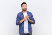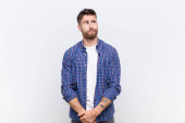 Zdjęcie "młody człowiek handdosme patrząc zmieszany i zdezorientowany, gryzący wargi nerwowym gestem, nie znając odpowiedzi na problem z płaską ścianą koloru" może być wykorzystywane do celów osobistych i komercyjnych zgodnie z warunkami zakupionej licencji Royalty-free. Obraz jest dostępny do pobrania w jakości wysokiej rozdzielczości do 5760x3840.