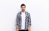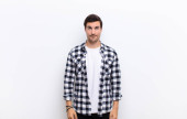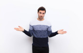 młody człowiek handdosme patrząc zmieszany i zdezorientowany, gryzący wargi nerwowym gestem, nie znając odpowiedzi na problem z płaską ścianą koloru