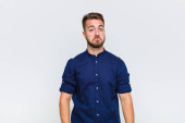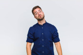 młody człowiek handdosme patrząc zmieszany i zdezorientowany, zastanawiając się lub próbuje rozwiązać problem lub myślenia o płaskiej ścianie kolor