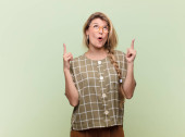 młoda blondynka wyglądająca na zszokowaną i zdumioną, ze szczęką opuszczoną w zaskoczeniu, gdy uświadomiła sobie coś niewiarygodnego przeciwko płaskiej ścianie