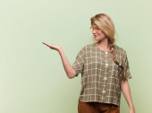 młoda blondynka wygląda poważnie i ciekawie, słuchając, starając się usłyszeć tajną rozmowę lub plotki, podsłuchiwanie na płaskiej ścianie kolor