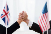 przycięty widok ambasadorów trzymających się za ręce w pobliżu Unii Europejskiej i flagi zjednoczonego Królestwa