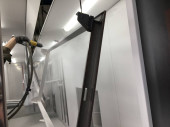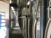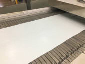 Linia do malowania proszkowego. Metalowe panele zawieszane są na napowietrznych liniach transportowych. Wyroby malarskie w polu elektrostatycznym.