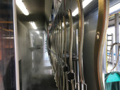 Linia do malowania proszkowego. Metalowe panele zawieszane są na napowietrznych liniach transportowych. Wyroby malarskie w polu elektrostatycznym.