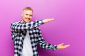 młody blondynka człowiek w kwadratowej koszuli uśmiecha się i wygląda przyjaźnie, pokazując numer trzy lub trzeci z ręki do przodu, odliczanie w dół