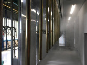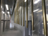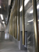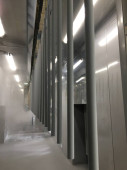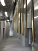 Linia do malowania proszkowego. Metalowe panele zawieszane są na napowietrznych liniach transportowych. Wyroby malarskie w polu elektrostatycznym.