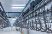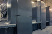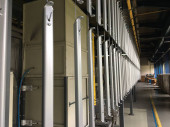 Linia do malowania proszkowego. Metalowe panele zawieszane są na napowietrznych liniach transportowych. Wyroby malarskie w polu elektrostatycznym.