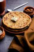 Zdjęcie "Sattu Ka Paratha / Nadziewana Channa Dal Mąka Paratha podawana z ogórkiem mango i twarogiem lub dahi" może być wykorzystywane do celów osobistych i komercyjnych zgodnie z warunkami zakupionej licencji Royalty-free. Obraz jest dostępny do pobrania w jakości wysokiej rozdzielczości do 5760x3840.