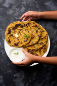 Sattu Ka Paratha / Nadziewana Channa Dal Mąka Paratha podawana z ogórkiem mango i twarogiem lub dahi