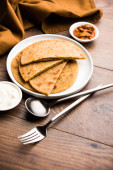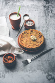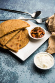 Sattu Ka Paratha / Nadziewana Channa Dal Mąka Paratha podawana z ogórkiem mango i twarogiem lub dahi