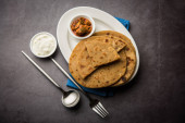 Zdjęcie "Sattu Ka Paratha / Nadziewana Channa Dal Mąka Paratha podawana z ogórkiem mango i twarogiem lub dahi" może być wykorzystywane do celów osobistych i komercyjnych zgodnie z warunkami zakupionej licencji Royalty-free. Obraz jest dostępny do pobrania w jakości wysokiej rozdzielczości do 5760x3840.