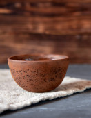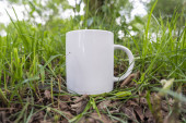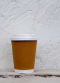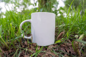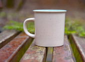 kubek na drewnianej ławce na rozmytym tle.