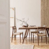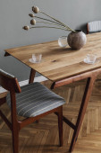 Zdjęcie "Nowoczesne i stylowe wnętrze jadalni ze wspaniałym drewnianym stołem, eleganckie krzesła i wystrój wnętrz. Szablon. Wystrój wnętrz. Szara ściana w tle. Minimalistyczna koncepcja aranżacji wnętrz." może być wykorzystywane do celów osobistych i komercyjnych zgodnie z warunkami zakupionej licencji Royalty-free. Obraz jest dostępny do pobrania w jakości wysokiej rozdzielczości do 5760x3840.