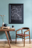 Zdjęcie "Nowoczesne i stylowe wnętrze jadalni ze wspaniałym drewnianym stołem, eleganckie krzesła i wystrój wnętrz. Szablon. Wystrój wnętrz. Szara ściana w tle. Minimalistyczna koncepcja aranżacji wnętrz." może być wykorzystywane do celów osobistych i komercyjnych zgodnie z warunkami zakupionej licencji Royalty-free. Obraz jest dostępny do pobrania w jakości wysokiej rozdzielczości do 5760x3840.