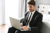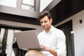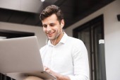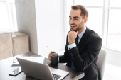 Zdjęcie zadowolonego biznesmena za pomocą laptopa i rozmowy o