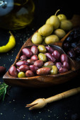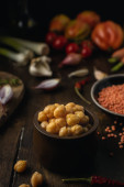 Asortyment roślinny, soczewica, ciecierzyca na brązowym drewnianym stole,