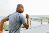 Zdjęcie atrakcyjnego mężczyzny ćwiczącego ze słuchawkami i biegającego rano po zielonym parku